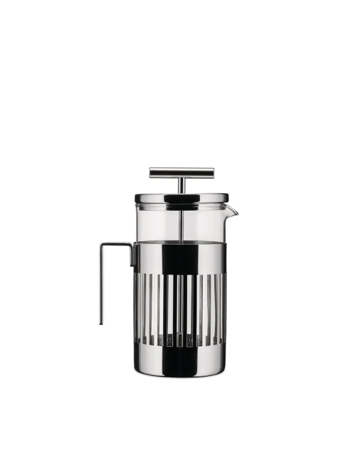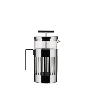 French press 9094 byl navržen slavným italským architektem Aldem Rossi, který rád ve svých projektech používá jednoduché geometrické tvary. Žáruvzdorný skleněný válec je umístěn do nerezového obalu v charakteristickém provedení pro tohoto návrháře. French press je ideální k přípravě kávy, čaje a bravurně zvládne našlehat pěnu z mléka do cappuccina. K dispozici je ve dvou velikostech.