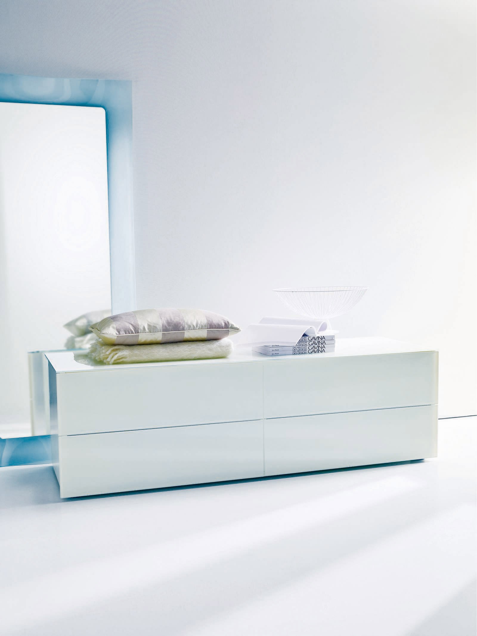 Designová komoda se 2 zásuvkami se strukturou z matného lakovaného dřeva. Horní deska a čela zásuvek jsou z temperovaného skla. Komoda je dispozici v různých barvách. Lze využít jako noční stolek. Kolekce nábytku „ENEA“ má moderní design a je ideální do ložnice.