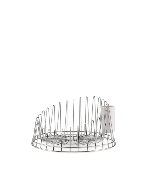 Nerezový odkapávač na nádobí se zásobníkem na příbory z termoplastické pryskyřice. Designérka Pauline Deltour vsadila na lehké a dynamické provedení vzestupně a sestupně tvarovaného nerezového drátu.