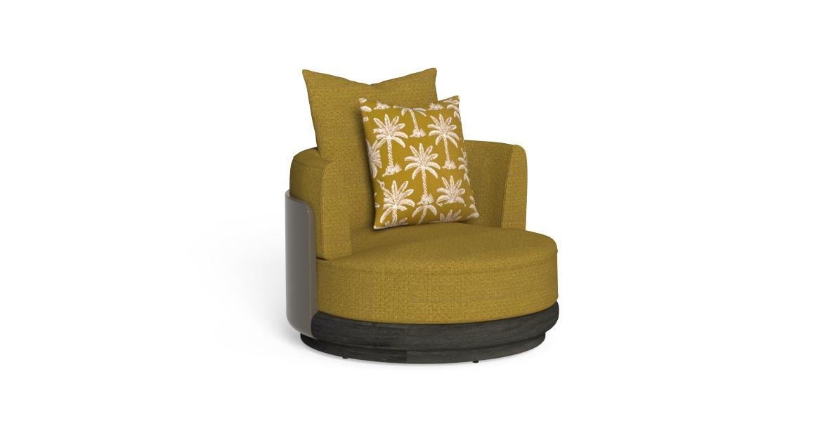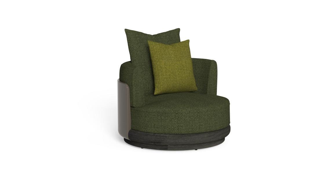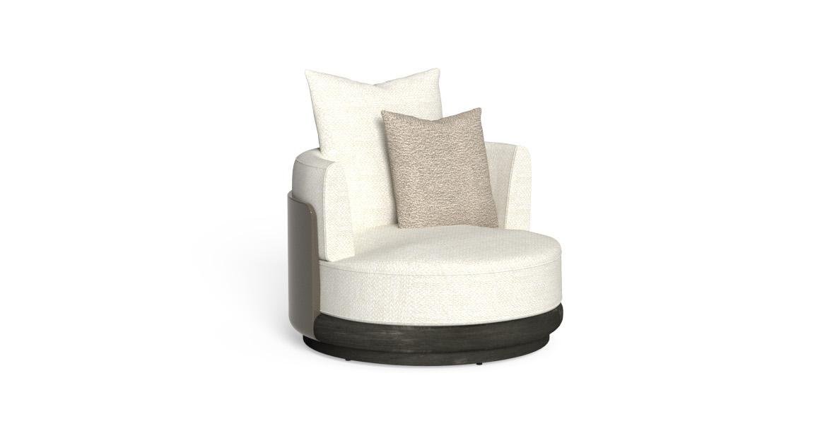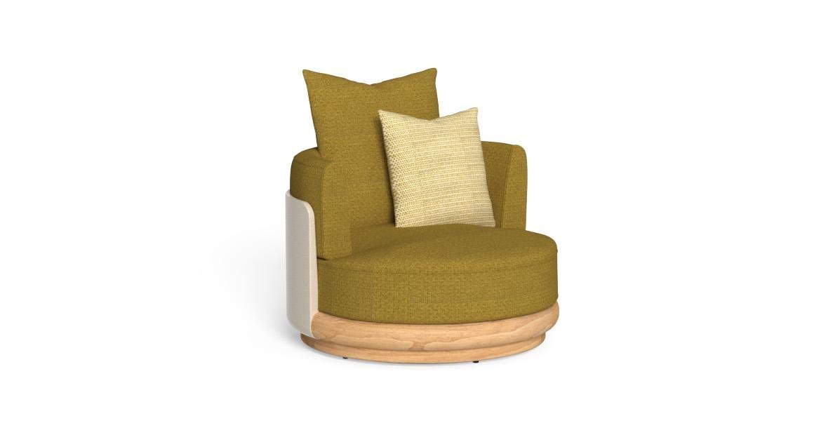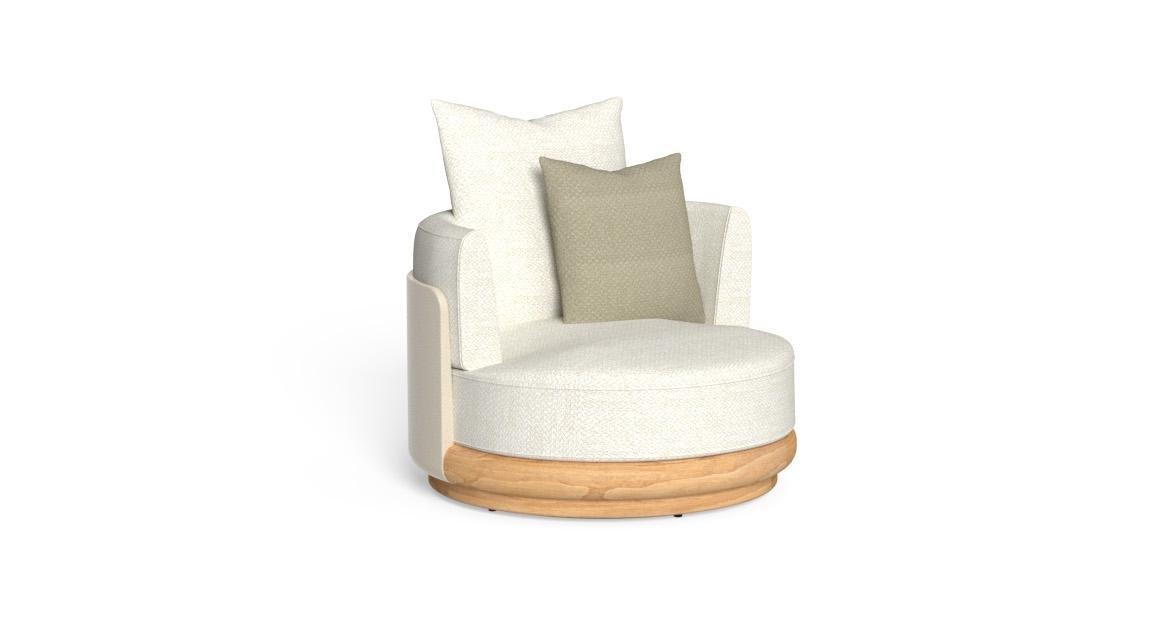 Ikonický solitér kolekce Itaca – otočné křeslo s pevným kruhovým podstavcem z materiálu Accoya® a elegantně tvarovaným opěradlem, které plynule obepíná sedák i opěrné polštáře a vytváří pocit útulného hnízda.