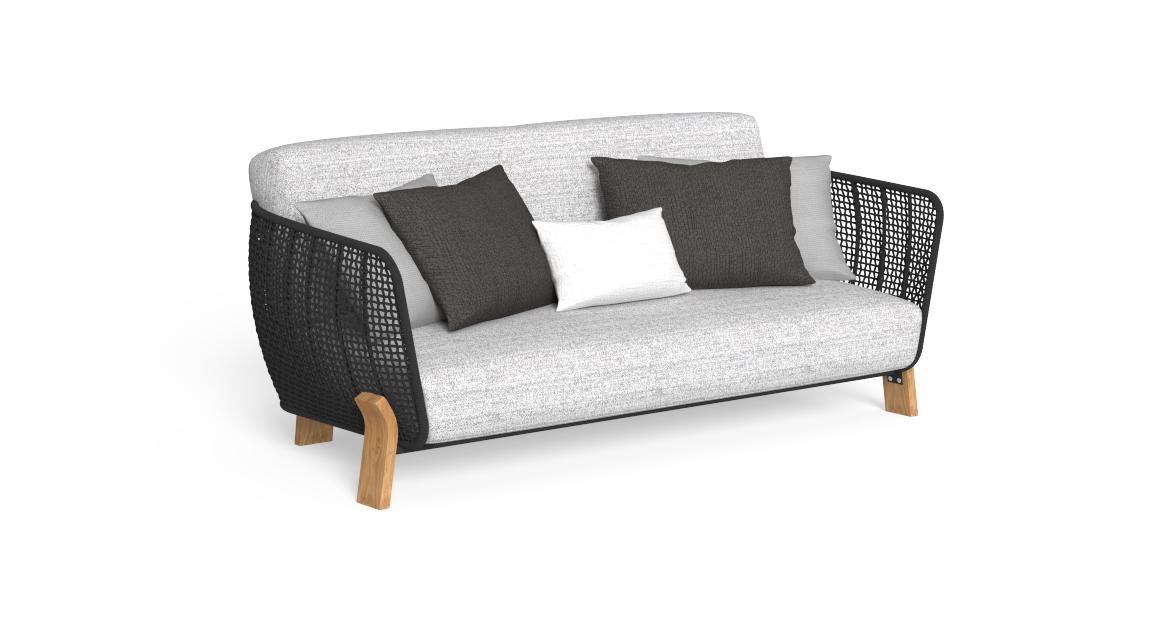 Designový love seat z kolekce Argo je dokonalým spojením jemně zakřivených linií a geometrických tvarů. Výrazné dřevěné nožky, které vystupují mimo hlavní konstrukci, dodávají sedačce osobitý charakter a lehkost. Opěrky a široké opěradlo jsou ručně opleteny syntetickým lanem, čímž vzniká efektní kontrast materiálů a objemů, který dokonale ladí s estetikou celé kolekce Argo. Sedačka je vybavena polštáři z rychleschnoucí pěny Quick Dry Foam a potažena tkaninami odolnými vůči povětrnostním vlivům. Skvěle se tak hodí pro stylové a zároveň funkční venkovní posezení.