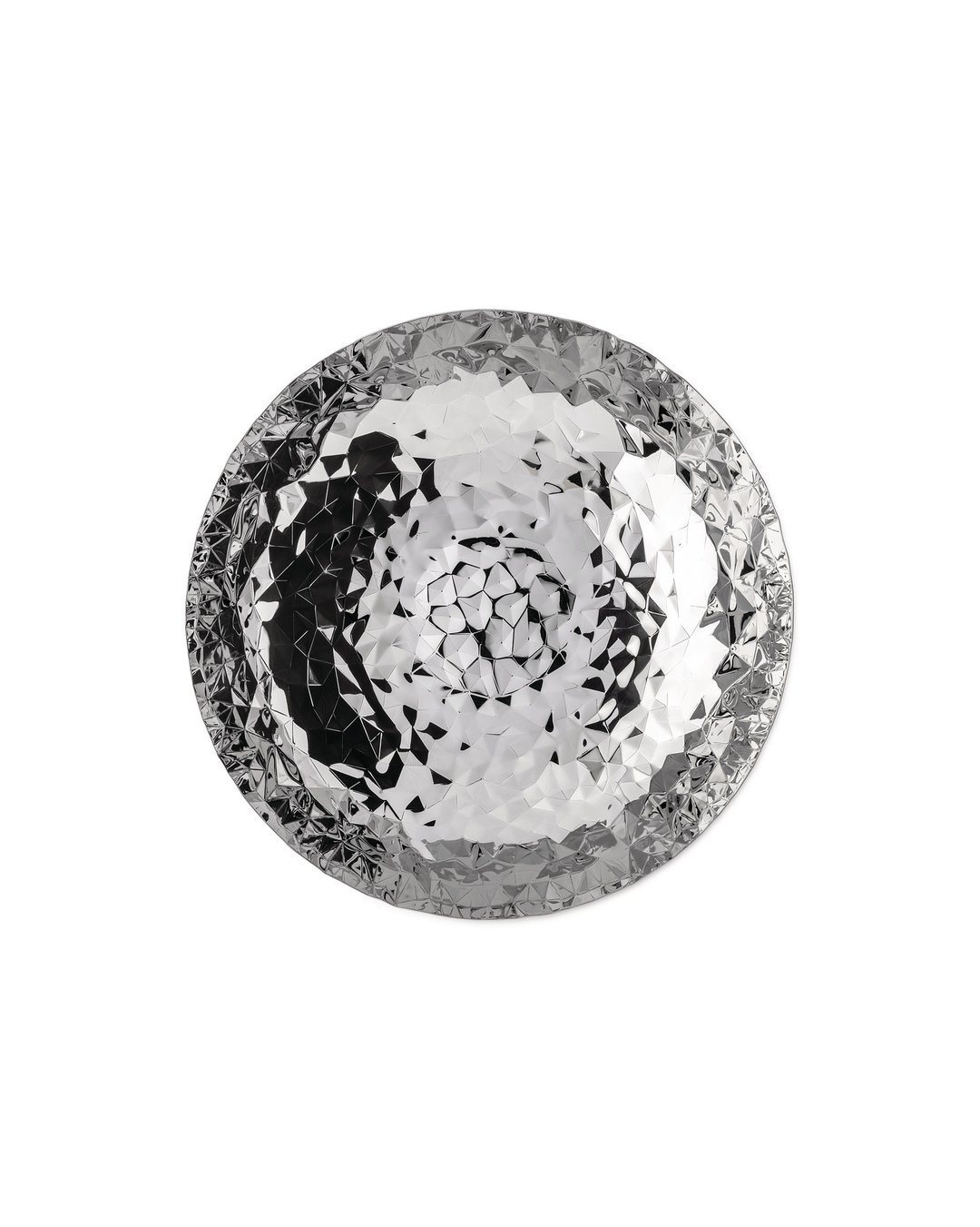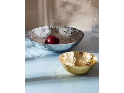 Středová nerezová mísa. Designérka Claudia Raimondo využila k tvorbě této originální mísy novou technologii – zpracování nerezové oceli za studena. Tvar mísy vytváří hru světelných odrazů, jako to známe z minulosti u tepaných předmětů vyrobených z drahých kovů.